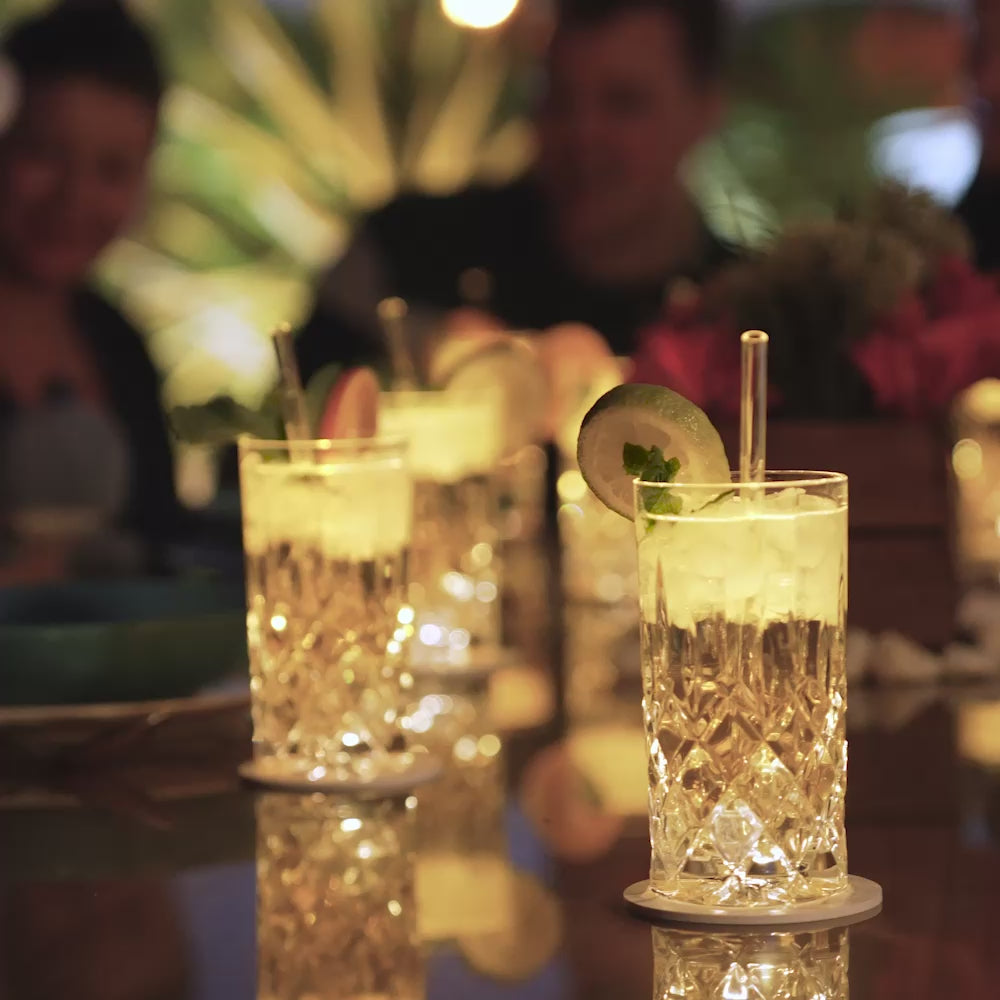 Nos dessous de verre illuminent ton verre uniquement lorsque tu le poses dessus. Dès que tu retires ton verre, la lumière s’éteint immédiatement. L’éclairage automatique est déclenché par un capteur de pression.