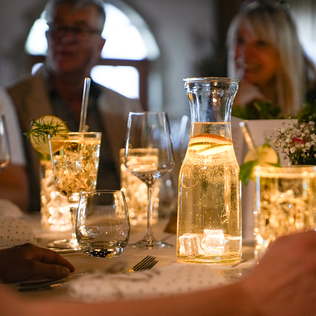 Onze LED-onderzetters schakelen automatisch in zodra er een glas op wordt geplaatst – en weer uit wanneer het wordt weggenomen. Een geïntegreerde druksensor zorgt voor dit effect. De LED-eenheid vormt het hart van onze onderzetters en laat het glas naar keuze in warmwit, rood, groen of blauw oplichten. Een echte blikvanger voor jullie bruiloftstafel, die emoties zichtbaar maakt en bij elke gast in herinnering blijft.